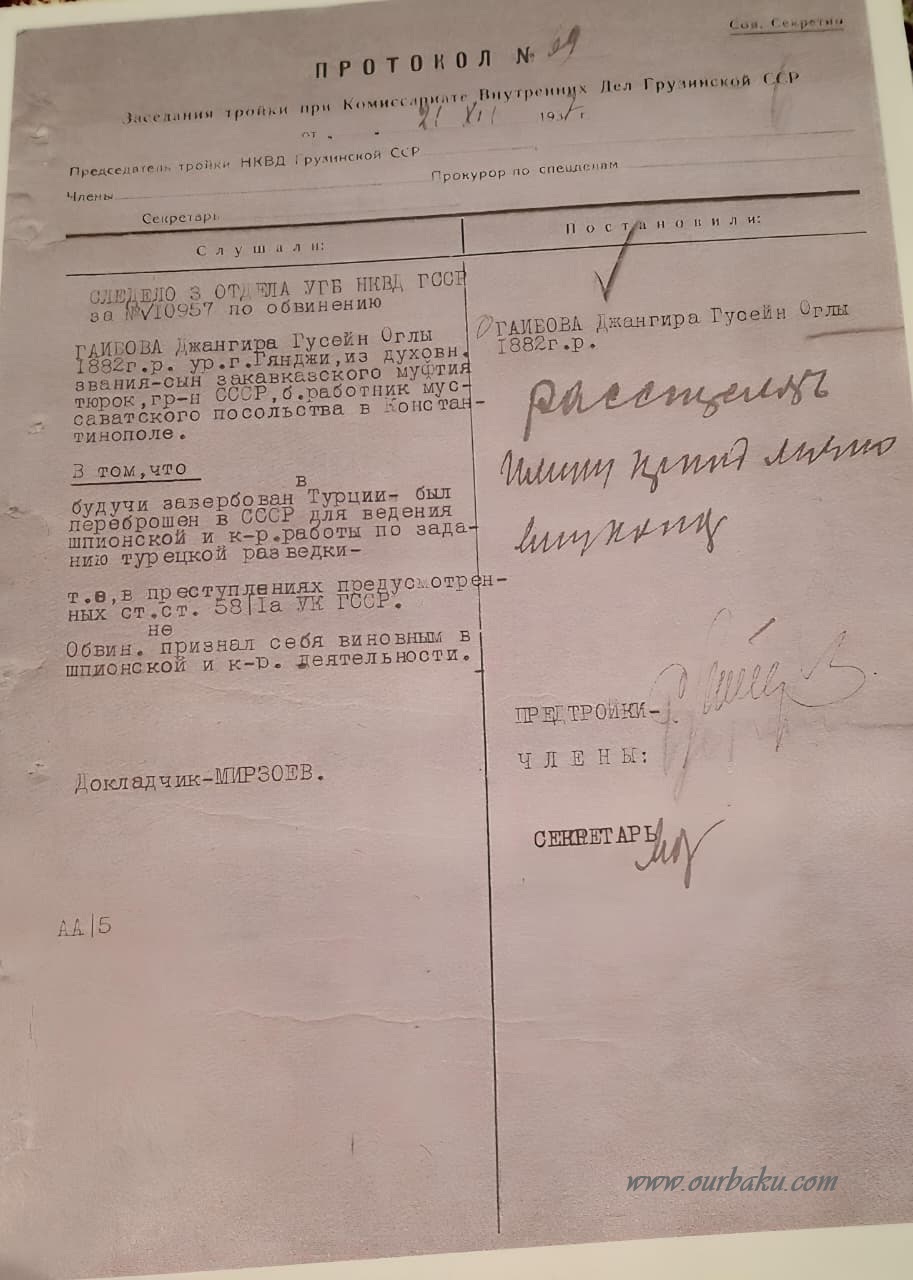 Гаибов Джахангир Гусейн Эфенди оглы. Протокол приговора тройки Комиссариата ВД Груз. ССР. 1937 г. Получено от Рустама Гаибова (Баку)